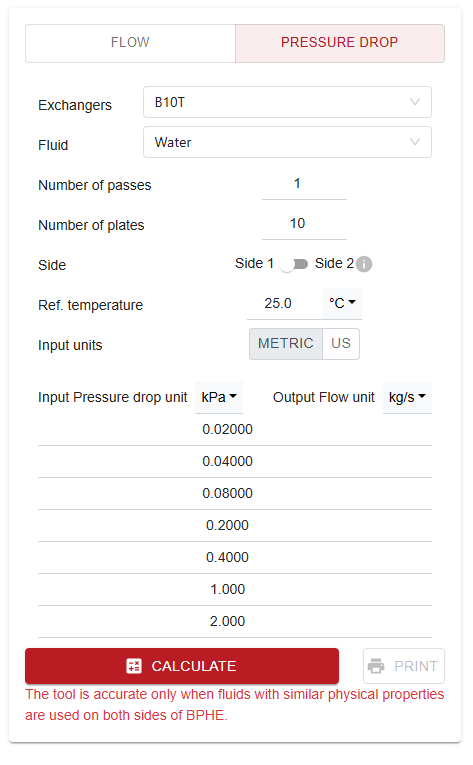 Fluid Select the fluid you are looking at. The tool is accurate only when fluids of similar physical properties are used on both sides of the BPHE.
